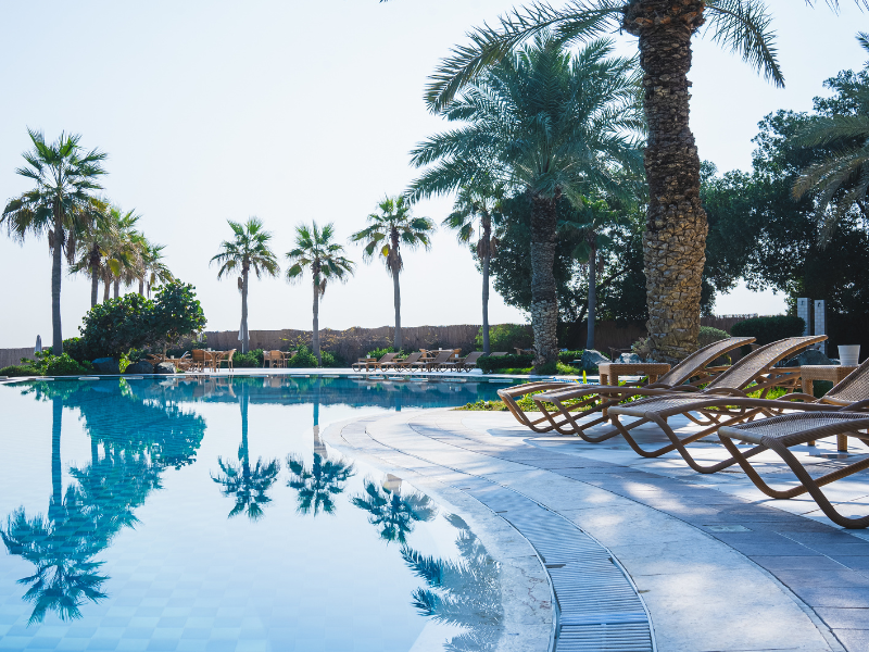يتميز حوض السباحة الخارجي بمساحته الواسعة مع إطلالة خلابة على رمال الشاطئ البيضاء ومدخل خاص إلى البحر.