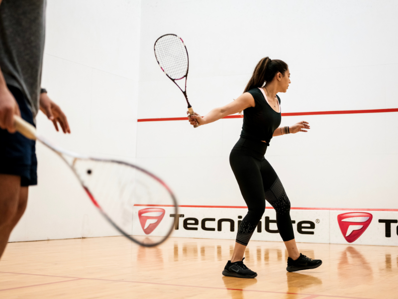 يتوفر ملعب اسكواش في الدور السفلي مع دورين لجلوس الجمهور والمشجعين لمتابعة فعاليات اللعب والتحدي لمزيد من التشويق.